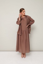 Двухпредметный комплект, состоящий из жакета и юбки. Жакет полуприлегающего силуэта, отрезной по линии талии. Перед и спинка с вертикальными рельефами, в которые вставлены рукава, сверху по окату со складками. Спинка со средним швом. Воротник пиджачного типа. Застежка на петли-пуговицы. Юбка А-силуэта, на притачном поясе, по бокам с резинками. Застежка на тесьму-молнию в среднем шве, который переходит в шлицу. Костюм на подкладке. Комплект декорирован съемной брошью в виде цветка.