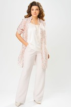 Туника полуприлегающего силуэта . Спинка со средним швом и талиевыми вытачками. По переду выполнены нагрудные вытачки, которые выходят из боковых швов. Низ туники ассиметричной формы. Вырез горловины округлой формы. Брюки прямые, слегка зауженные к колену. На притачном поясе сзади с резинкой. Брюки с карманами. Застежка на тесьму молнию. Костюм декорирован съемной брошью.