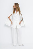 Туника полуприлегающего силуэта . Спинка со средним швом и талиевыми вытачками. По переду выполнены нагрудные вытачки, которые выходят из боковых швов. Низ туники ассиметричной формы. Вырез горловины округлой формы. Брюки прямые, слегка зауженные к колену. На притачном поясе сзади с резинкой. Брюки с карманами. Застежка на тесьму молнию. Костюм декорирован съемной брошью.