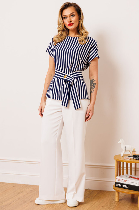 Топ полуприлегающего силуэта, выполнен из ткани в полоску. По переду топ с нагрудной вытачкой, выходящей из бокового шва . Спинка со средним швом. Застежка в среднем шве на навесную петлю и пуговицу. Горловина обработана подкройной обтачкой. В боковых швах топ с разрезами. Брюки прямые сверху на притачном поясе, сзади с резинкой. На передних половинках брюк обработаны карманы.