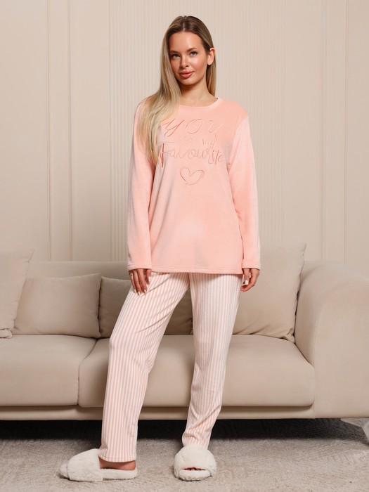 Костюм из трикотажного полотна «вельмонд двухсторонний » в комбинации двух видов: гладкокрашеного и с рисунком в узкую полоску в единой цветовой гамме, состоящий из джемпера и брюк. Джемпер – из гладкокрашеного полотна, с длинными втачными рукавами, горловиной овальной формы, обработанной втачной планкой из основного материала, разрезами в боковых швах и вышивкой на полочке. Брюки – длинные, прямые, с эластичной тесьмой по линии талии.