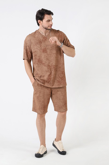 Костюм мужской, состоящий из футболки и шорт. Футболка - свободного покроя, короткими втачными рукавами и горловиной овальной формы, обработанной втачной планкой. По шву втачивания планки настрочена двойная отделочная строчка. Шорты - удлиненные, с карманами в боковых швах, на притачном поясе с эластичной тесьмой внутри.