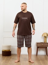 Костюм мужской, состоящий из футболки и брюк. Футболка однотонная с принтом на груди; модель свободная, со спущенной линией плеч, овальным вырезом горловины. Брюки из полотна с набивным рисунком эксклюзивного дизайна, прямые, с боковыми карманами с обтачными входами, на притачном поясе с отстроченной эластичной тесьмой.