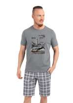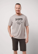 Костюм мужской, состоящий из футболки и шорт. Футболка однотонная с принтом на груди; модель свободная, со спущенной линией плеч. Шорты из полотна с набивным рисунком эксклюзивного дизайна, с боковыми карманами с обтачными входами, на притачном поясе с отстроченной эластичной тесьмой.