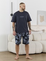 Костюм мужской, состоящий из футболки и брюк. Футболка однотонная с принтом на груди; модель свободная, со спущенной линией плеч, овальным вырезом горловины. Брюки из полотна с набивным рисунком эксклюзивного дизайна, прямые, с боковыми карманами с обтачными входами, на притачном поясе с отстроченной эластичной тесьмой.
