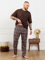 Костюм мужской, состоящий из футболки и брюк. Футболка однотонная с принтом на груди; модель свободная, со спущенной линией плеч, втачными рукавами, овальным вырезом горловины. Брюки из полотна с набивным рисунком эксклюзивного дизайна, прямые, с боковыми карманами с обтачными входами, на притачном поясе с отстроченной эластичной тесьмой.