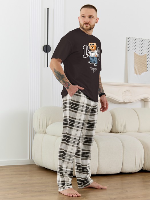 Костюм мужской, состоящий из футболки и брюк. Футболка однотонная с принтом на груди; модель свободная, со спущенной линией плеч, втачными рукавами, овальным вырезом горловины. Брюки из полотна с набивным рисунком эксклюзивного дизайна, прямые, с боковыми карманами с обтачными входами, на притачном поясе с отстроченной эластичной тесьмой.