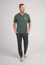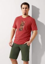 Костюм мужской, состоящий из футболки и брюк. Футболка однотонная с принтом на груди; модель свободная, со спущенной линией плеч, овальным вырезом горловины. Брюки из полотна с набивным рисунком эксклюзивного дизайна, прямые, с боковыми карманами с обтачными входами, на притачном поясе с отстроченной эластичной тесьмой.