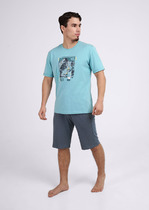 Костюм мужской, состоящий из футболки и брюк. Футболка однотонная с принтом на груди; модель свободная, со спущенной линией плеч. Брюки из полотна с набивным рисунком в узкую черно-белую полоску, прямые, с боковыми карманами с обтачными входами, на притачном поясе с отстроченной эластичной тесьмой.