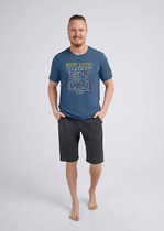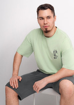 Костюм мужской, состоящий из футболки и шорт. Футболка однотонная с принтом на груди; модель свободная, со спущенной линией плеч. Шорты из полотна с набивным рисунком в узкую черно-белую полоску, с боковыми карманами с обтачными входами, на притачном поясе с отстроченной эластичной тесьмой.