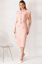 Костюм двухпредметный: состоит из джемпера и платья. Элегантный укороченный джемпер-кейп прямого свободного силуэта с округлой горловиной и фигурным лифом. Рукав втачной широкий, от линии локтя до запястья есть дополнительное отверстие для рук. Платье прямого силуэта, с небольшим расширением к низу, длиной макси. Перед с нагрудной вытачкой из бокового шва. Вырез горловины переда и спинки имеют V-образную форму.