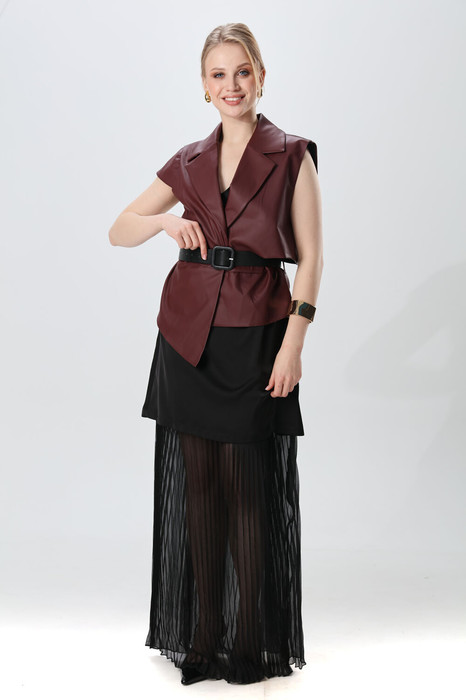 Костюм двухпредметный: состоит из платья и жилета. Платье прямого силуэта, с небольшим расширением к низу, длиной макси. Перед с нагрудной вытачкой из бокового шва. Вырез горловины переда и спинки имеют V-образную форму. Низ платья декорирован воланом из гофрированного шифона. Жилет из экокожи прямого силуэта с воротником пиджачного типа. По правой пройме переда расположена фигурная  деталь  "крылышко". Спинка со средним швом. По низу правого переда и низу правой спинки фигурная деталь. По левой части переда и левой части спинки отлетная кокетка. Изделие идёт в комплекте с ремнем из экокожи.