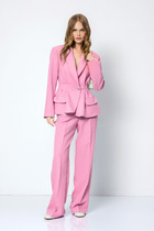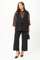 Костюм трехпредметный: состоит из блузы, юбки и жилета. Блуза прямого кроя с центральной застёжкой на петли и пуговицы. Вырез горловины глубокий округлый. Линия плеча приспущена. На рукавах изделия заложена декоративная сборка с регулируемыми завязками (кулиса). Жилет удлиненный свободного прямого силуэта, воротник пиджачного типа. Линия низа по переду и спинке фигурная ассиметричная. Короткий рукав-крылышко. Талия фиксируется съемным ремнем из экокожи, для которого в боковых швах оформлены шлевки. Ремень идёт в комплекте к изделию. Юбка - солнце с узким поясом. В боковых швах расположены карманы. Застёжка на петлю и пуговицу и молнию по спинке.