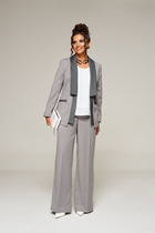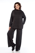 Эффектный костюм из экокожи на хлопковой основе двухпредметный: жилет и брюки. Жилет полуприлегающего силуэта. Горловина и пройма обработана обтачкой. По переду нагрудная вытачка, переходящая в подрез с имитацией кармана. Застёжка на петли-кнопки. Низ асимметричен. По спинке две вытачки и хлястик на резинке. Длина изделия 50 см. Брюки свободного кроя, верхний срез представлен широкой резинкой, с накладными карманами. Длина брюк 101 см.