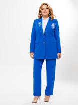Трикотажный костюм двухпредметный: состоит из джемпера и юбки. Джемпер комбинированный свободного кроя со спущенной линией плеча. Горловина обработана воротником-стойкой с запахом. Рукава со вставкой из текстурного трикотажа "косичка". По низу рукава и изделия есть манжета. По переду изделие декорировано фигурными фалдами из основной ткани. Длина изделия 71 см. Длина рукава 58 см. Юбка-карандаш на резинке по линии талии. По боковым швам изделие декорировано трикотажной "косичкой".