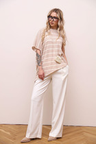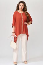 Костюм двухпредметный: состоит из джемпера и брюк. Джемпер из комбинированной ткани  свободного силуэта с округлой горловиной. Рукав с передними и задними швами. Верхняя и нижняя часть рукава образуют между собой разрез. Карманы в боковых швах. Брюки прямого силуэта большого объёма. Линия талии занижена. Пояс притачной. На передних половинках брюк карманы с отрезным бочком. На задних половинках брюк отрезная кокетка и накладные карманы.