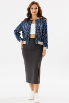 Костюм двухпредметный: состоит из блузы и брюк. Блуза прямого силуэта свободного кроя с втачным рукавом со спущенной проймой. По горловине переда планка с запахом. Воротник с цельнокроенной стойкой. По низу переда имеется нашивка из экокожи. Боковые швы с разрезами. Брюки средней посадки заужены к низу. Пояс притачной на резинке. В петли на поясе вставлен шнур. Передние половинки брюк с вертикальными швами. В боковых швах выполнены наклонные карманы.