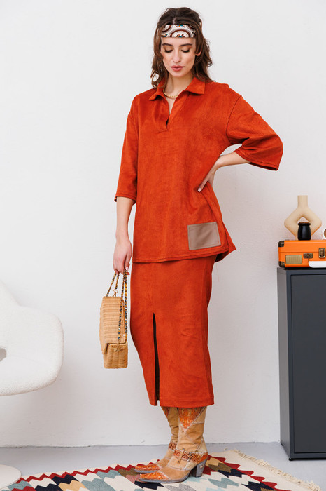 Костюм двухпредметный: состоит из блузы и юбки. Блуза прямого силуэта свободного кроя с втачным рукавом со спущенной проймой. По горловине переда планка с запахом. Воротник с цельнокроенной стойкой. По низу переда имеется нашивка из экокожи. Боковые швы с разрезами. Юбка длиной миди прямая на резинке. Разрез по переду. Изделие без подкладки.
