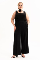 Костюм двухпредметный: состоит из жилета и брюк. Жилет полуприлегающего силуэта на подкладке. По переду вытачка, переходящая в подрез, функциональный карман. Застежка на петли-пуговицы. По спинке вытачки и хлястик. Брюки свободного кроя, верхний срез представлен широкой резинкой, с карманами.