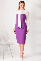 Костюм двухпредметный: состоит из жилета и брюк. Жилет назапах с полукруглым вырезом. Застёжка на петли и пуговицы на уровне плечевого шва. легантные брюки прямого кроя с боковыми карманами с отрезным бочком. Застежка на молнию и пуговицу. По переду - складки. Задние половинки с талиевыми вытачками и прорезными карманами с листочкой. Верхний срез обработан притачным поясом, по спинке на резинке.