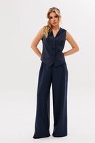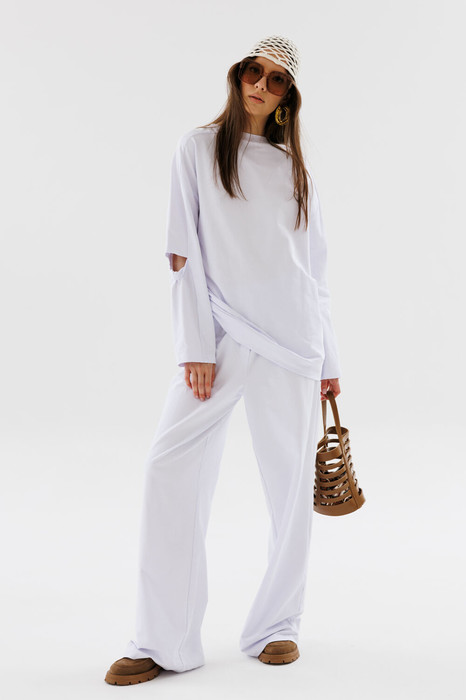 Костюм двухпредметный: состоит из джемпера и брюк. Джемпер свободного силуэта с округлой горловиной. Рукав комбинированного кроя, с передними и задними швами. Верхняя и нижняя часть рукава образуют между собой разрез. По спинке изделие декорировано авторским вязаным элементом ручной работы. Брюки свободного кроя, верхний срез представлен широкой резинкой, с карманами.
