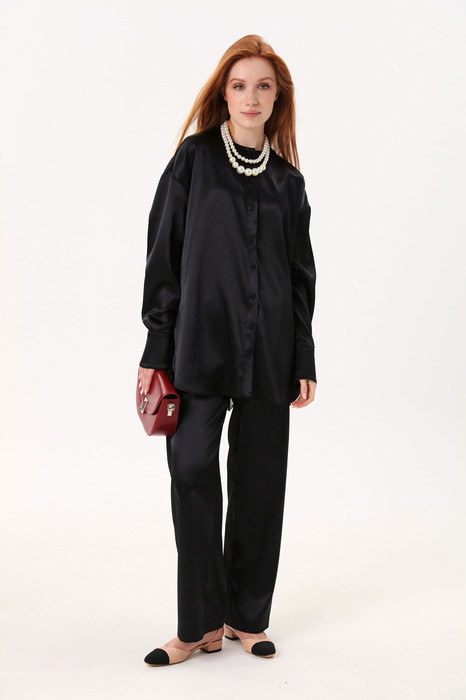 Костюм двухпредметный: состоит из блузы и брюк. Блуза свободного кроя с округлым вырезом горловины. Центральная застёжка на петли и пуговицы. Рукав втачной одношовный спущенный с притачной манжетой на петлю и пуговицу. Спинка с отрезной кокеткой, нижняя часть спинки декорирована плиссированным шифоном. Низ изделия фигурный. Боковые швы с разрезами. Брюки свободного кроя, верхний срез представлен широкой резинкой, с карманами.