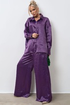 Костюм двухпредметный: состоит из жакета и брюк. Жакет рубашечного типа прямого силуэта с асимметричным низом. Рукав втачной со спущенной линией плеча, фиксируется на пату. Застежка центральная на петли и пуговицы, смещённая по косой. На левой полочке накладной карман с клапаном. Воротник отложной на стойке до половины спинки. Комфортные брюки свободного кроя со складками и карманами по переду, зауженные к низу. Пояс притачной со шлёвками и центральной застёжкой на гульфик и молнию. По спинке изделия накладные карманы и резинка.