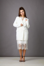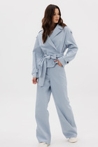 Костюм двухпредметный: состоит из блузы и брюк. Блуза свободного прямого кроя из комбинированной ткани. Воротник стояче-отложной рубашечного типа, застёжка центральная на петли и пуговицы. Рукав втачной одношовный с притачной манжетой на петлю и пуговицу. Спинка с отрезной кокеткой, нижняя часть спинки декорирована трикотажным гофре. Низ изделия по переду ассиметричный. Брюки свободного кроя, верхний срез представлен широкой резинкой, с карманами.