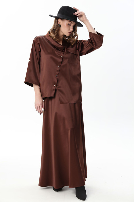 Костюм комбинированный двухпредметный: состоит из жакета и юбки. Жакет рубашечного типа прямого силуэта с асимметричным низом. Рукав втачной со спущенной линией плеча, фиксируется на пату. Застежка центральная на петли и пуговицы, смещённая по косой. На левой полочке накладной карман с клапаном. Воротник отложной на стойке до половины спинки. Юбка - солнце макси с узким поясом. В боковых швах расположены карманы. Застёжка на петлю и пуговицу и молнию по спинке.