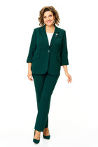 Костюм комбинированный двухпредметный: состоит из жакета и юбки. Жакет рубашечного типа прямого силуэта с асимметричным низом. Рукав втачной со спущенной линией плеча, фиксируется на пату. Застежка центральная на петли и пуговицы, смещённая по косой. На левой полочке накладной карман с клапаном. Воротник отложной на стойке до половины спинки. Юбка - солнце макси с узким поясом. В боковых швах расположены карманы. Застёжка на петлю и пуговицу и молнию по спинке.