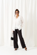 Костюм двухпредметный: состоит из жакета и брюк. Жакет прямого силуэта, воротник пиджачного типа, рукав одношовный, втачной с незначительно спущенной линией плеча, длинный, с притачной манжетой, декорированной разрезом. По линии ткани настрачная кулиса с завязками из основной ткани. Застежка центрально-бортовая. Линия низа верхней части фигурная ассиметричная. Брюки свободного кроя, верхний срез представлен широкой резинкой, с карманами.