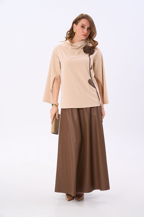 Костюм двухпредметный: состоит из джемпера и юбки. Джемпер-кейп прямого свободного силуэта. Горловина с цельнокроеным воротником-стойкой. Рукав втачной широкий, от линии локтя до запястья есть дополнительное отверстие для рук. Декорирован цветком из контрастной ткани. Юбка - солнце с узким поясом. В боковых швах расположены карманы. Застёжка на петлю и пуговицу и молнию по спинке.