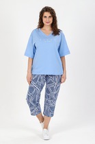 Костюм двухпредметный: состоит из жакета и юбки. Жакет прямого силуэта с имитацией центральной застёжки на пуговицы. Рукав втачной одношовный, длиной три четверти,застегивающийся на пату. Воротник пиджачного типа . Линия низа фигурная, симметричная . По левому переду расположена декоративная деталь. Юбка длиной миди, расклешенная к низу, с асимметричным низом. Пояс притачной, по спинке собран на резинку. Переднее полотнище состоит из трех частей. Правая часть скреплена отделочной строчкой и кнопками. В боковых швах изделия расположены карманы. По спинке изделия идёт средний шов и две вытачки для удачной посадки по фигуре. Юбка без подкладки.