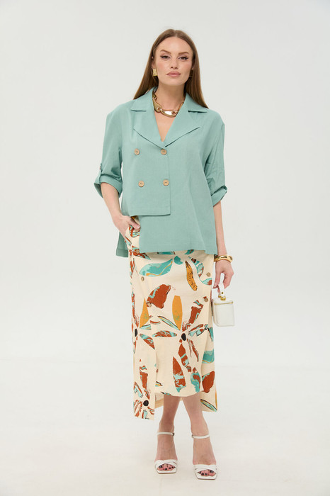 Костюм двухпредметный: состоит из жакета и юбки. Жакет прямого силуэта с имитацией центральной застёжки на пуговицы. Рукав втачной одношовный, длиной три четверти,застегивающийся на пату. Воротник пиджачного типа . Линия низа фигурная, симметричная . Юбка длиной миди, расклешенная к низу, с асимметричным низом. Пояс притачной, по спинке собран на резинку. Переднее полотнище состоит из трех частей. Правая часть скреплена отделочной строчкой и кнопками. В боковых швах изделия расположены карманы. По спинке изделия идёт средний шов и две вытачки для удачной посадки по фигуре. Юбка без подкладки.