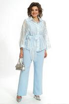 Костюм двухпредметный: состоит из жакета и юбки. Жакет рубашечного типа прямого силуэта с асимметричным низом. Рукав втачной со спущенной линией плеча, фиксируется на пату. Застежка центральная на петли и пуговицы, смещённая по косой. Воротник отложной на стойке до половины спинки.Юбка длиной миди, расклешенная к низу, с асимметричным низом. Пояс притачной, по спинке собран на резинку. Переднее полотнище состоит из трех частей. Правая часть скреплена отделочной строчкой и кнопками. В боковых швах изделия расположены карманы. По спинке изделия идёт средний шов и две вытачки для удачной посадки по фигуре. Юбка без подкладки.