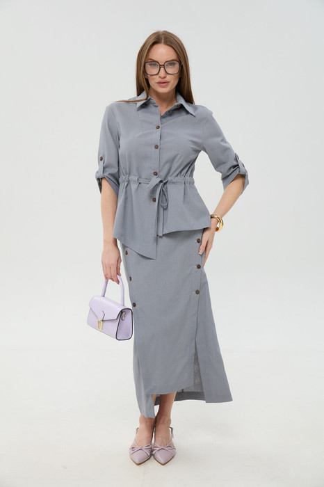 Костюм двухпредметный: состоит из жакета и юбки. Жакет прямого силуэта, воротник пиджачного типа, рукав одношовный, втачной с незначительно спущенной линией плеча, длиной три четверти, с патой. По линии ткани настрачная кулиса с завязками из основной ткани. Застежка центрально-бортовая. Линия низа верхней части фигурная ассиметричная. Юбка длиной миди, расклешенная к низу, с асимметричным низом. Пояс притачной, по спинке собран на резинку. Переднее полотнище состоит из трех частей. Правая часть скреплена отделочной строчкой и кнопками. В боковых швах изделия расположены карманы. По спинке изделия идёт средний шов и две вытачки для удачной посадки по фигуре. Юбка без подкладки.
