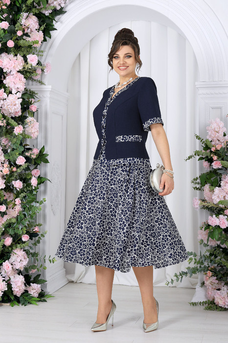Костюм идеально подойдёт для праздничных мероприятий, торжественных выходов, а также для деловых и повседневных образов в весенне-летний период. Контрастное сочетание однотонного жакета и лёгкой юбки с выразительным принтом визуально стройнит фигуру и подчёркивает силуэт, делая образ нарядным и универсальным одновременно.
