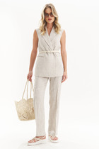 Брюки классические, длинные, прямого силуэта, с посадкой на талии, выполнены из ткани «крэш-вискоза». Модель без стрелок, с центральной застёжкой на тесьму-«молнию», на притачном поясе, застегивающемся на петлю и пуговицу. Спереди обработаны наклонные боковые карманы. Передние и задние половинки брюк с талиевыми вытачками, направленными от пояса вниз. Для лучшего прилегания брюк в области талии в поясе по задним половинкам вставлена эластичная лента. Длина брюк по боковому (с поясом) --107 см (50-52 р-р), 108 см (54-58 р-р).