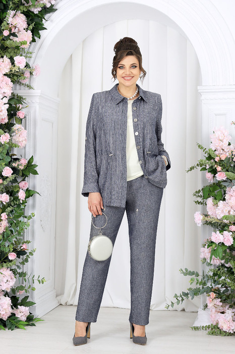 Комплект брючный 3-х предметный, состоящий из жакета, брюк и джемпера. Жакет выполнен из костюмно-плательной ткани лён полоска, брюки выполнены из костюмно-плательной ткани лён однотон, джемпер выполненный из трикотажного полотна.