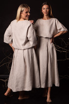 Брюки прямые от бедра. Изделие на широком поясе, в который вставлена резинка. Карманы в боковых швах.