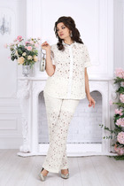 Элегантный комплект, состоящий из брюк и рубашки. Рубашка прямого силуэта, умеренная по объему, длиной до середины бедер. Центральная бортовая застежка на петли и пуговицы. Воротник рубашечный. Спущенная линия плеча. Свободный короткий рукав. Спинка прямая. Изделие без подкладки. Брюки прямые, свободного кроя, без подкладки. Пояс на резинке (без застежки). Карманы в боковых швах.