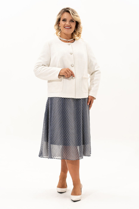 Невероятно нарядный классический женский комплект - двойка ALGRANDA: жакет и платье - это стильное и комфортное решение для женщин больших размеров, которые ценят комфорт и стиль. Жакет пошит из костюмной жаккардовой ткани на подкладке , в состав которой входит вискоза и нейлон, это обеспечивает человеку свободу движения. Жакет короткий, полуприлегающего силуэта на подкладке. Спинка со средним швом. По переду жакета есть рельефные швы от плеча. Застёжка на петли и пуговицы. Рукав втачной , длинный, двухшовный. Горловина круглая, смотрится очень актуально и эффектно в сочетании с накладными карманами, которые украшены крупным жемчугом. В комплекте к жакету идёт шифоновое платье на трикотажной подкладке. Горловина платья овальной формы, нагрудные выточки направлены от бокового шва к центру груди, спинка со средним швом и каплевидной застёжкой на пуговице. Рукав втачной, одношовный , низ собран на эластичную тесьму. Это воздушное платье очень красиво смотрится в сочетании с жакетом. В этом комплекте вы будете выглядеть безупречно!Отличный вариант для офиса и вечернего гардероба, а также и просто для повседневного применения. Грация, изящество, утончённые декоративные элементы делают этот комплект уникальным.