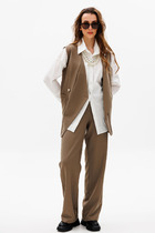 Брюки прямые с боковыми закругленными карманами, кокеткой на задних половинках, накладными карманами фантазийной формы. Верхний срез обработан поясом со шлевками. На передних и задних половинках отстрочены «стрелки».