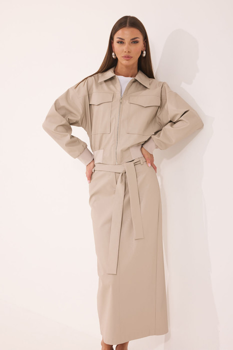 Комплект женский двухпредметный, состоит из жакета (на подкладке) и юбки, выполнен из экокожи.