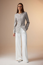 Жакет покроя спущенное плечо с центрально-боковой застежкой на планку на петли-пуговицы. Рукав длинный, низ обработан манжетой на две пуговицы. На спинке расположен средний шов и горизонтально направленная кокетка. По переду также расположена кокетка, вставлены клапаны. Горловина оформлена стояче-отложным воротником с отрезной стойкой. Жакет укорочен, слегка закрывает линию талии.