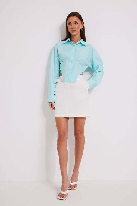 Юбка прямая, укороченная, переднее полотнище со швом, в котором расположена застежка на гульфик. На переде расположены наклонные боковые карманы. Верхний срез юбки обработан обтачкой. Юбка выполнена на подкладке. На заднем и переднем полотнище расположены талевые вытачки и шлевки.