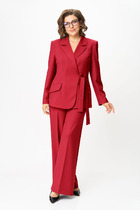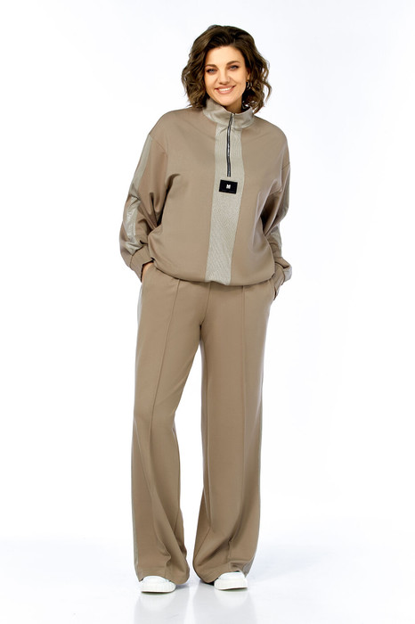 Костюм женский спорт-шик. Джемпер прямого силуэта, со спущенным рукавом. Воротник-стойка из отделочной ткани, планка по центру, в которой вставлена молния, декаротивная нашивка. Рукав с планками из отделочной ткани и декоративные защипы на манжетах. По низу кулиска с фиксаторами. Брюки прямые, по переду застрочены стрелки, по внешней стороне отделочные детали. Карманы в боковых швах, пояс на резинке.