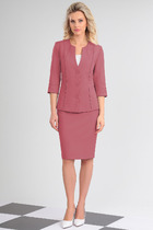 Жакет на подкладке с центрально-бортовой застежкой на две пуговицы, рукав 3\4 с отложной манжетой. Спинка со средним швом, в котором расположена шлица.