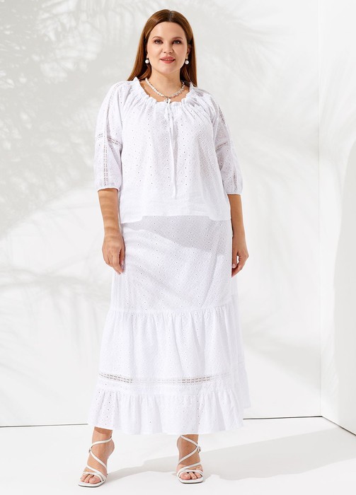 Коплект женский из хлопковой ткани для пвседневной носки. Комплект состоит из блузы и юбки. Блуза свободного кроя с укороченым рукавом.Так же есть сборка по горловине. Юбка расширяющаяся к низу с двумя отрезными воланами.