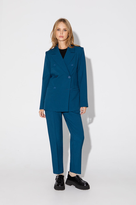 Классический костюм-двойка из двубортного жакета и укороченных брюк со стрелками. Детали: жакет полуприлегающего силуэта, пиджачный воротник, перед с прорезными карманами, двубортная застежка на петли и пуговицы, спинка со средним швом, рукава втачные двухшовные, жакет на подкладке. Брюки со средней посадкой, притачной пояс со шлевками, передние половины с небольшими мягкими складками и заутюженными стрелками, застежка на молнию и пуговицу, боковые карманы.